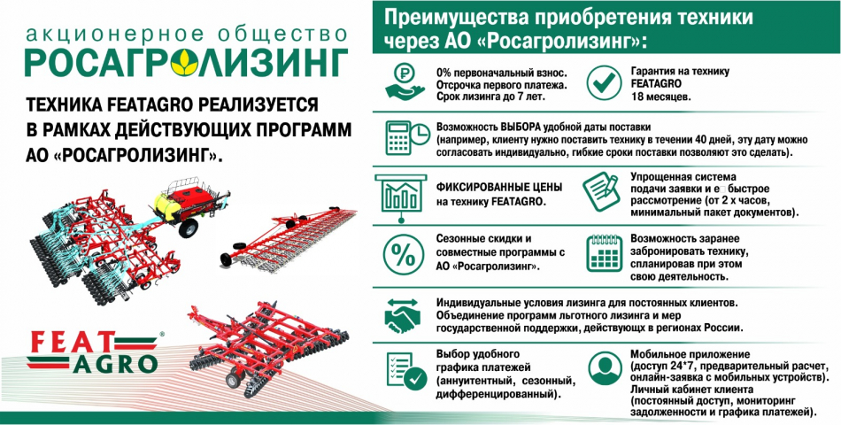 - более 120 моделей сельхозтехники различного назначения выпускается под торговой маркой FeatAgro в соответствии с Сертификатом ГОСТ Р ISO 9001-2015;