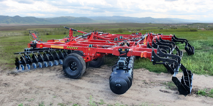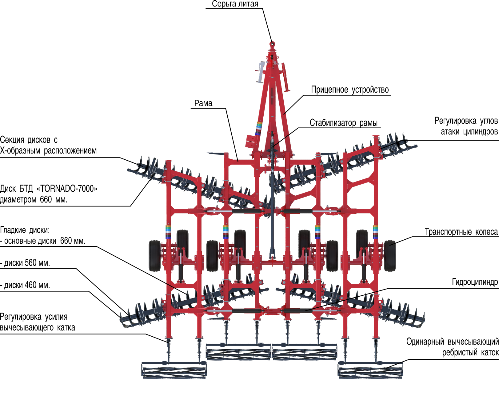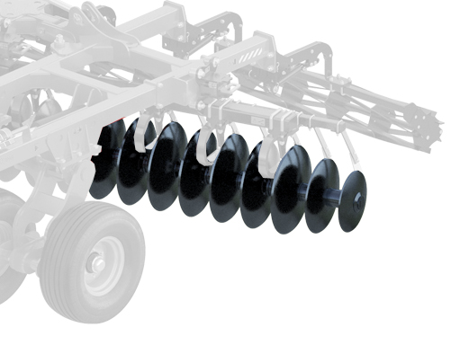 Диски первого ряда выполнены с выбивкой диаметром 660 мм с толщиной 8 мм выполнены из стали 65Г (режущая кромка обработана ТВЧ) позволяют вести гарантированно вести обработку почвы на глубину до 16 см, а диски второго ряда гладкие, что позволяет с меньшими усилиями разделывать стерню, максимально качественно подрезать корни и создания ровного фона;
