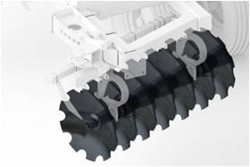 Тандемные колеса центральной рамы и боковых крыльев на балансирных рычагах снижают ударные нагрузки на оси колес и повышают копирование рельефа;