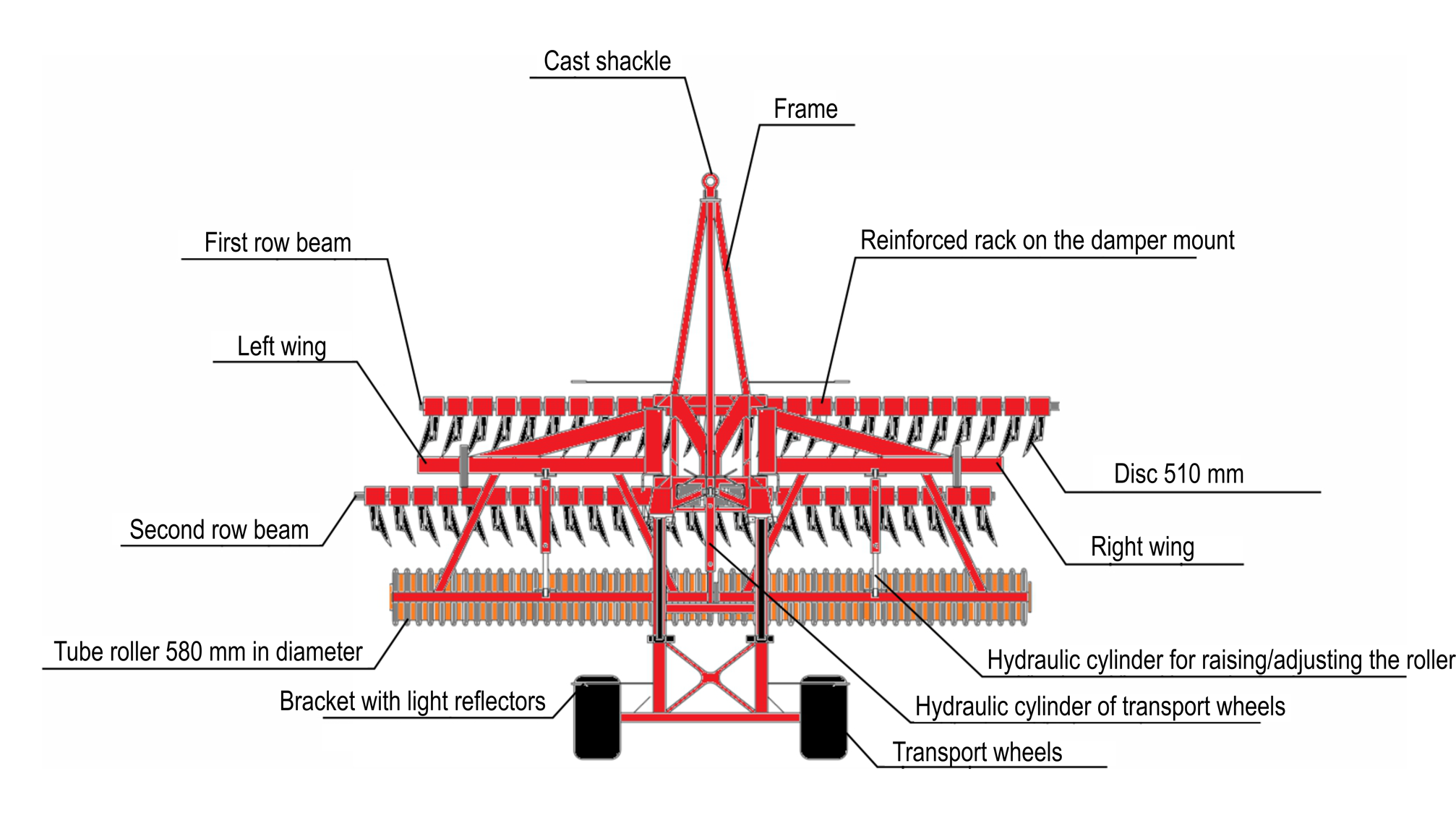 Batteries of discs are arranged in two rows with different angles of attack: the front row of discs is 22 degrees, the back row is 15 degrees, while the angle of inclination of both batteries is the same - 12 degrees, due to this, a more aggressive method of processing is carried out, guaranteed immersion of the discs even in heavy soils and high-quality mixing plant residues with soil;