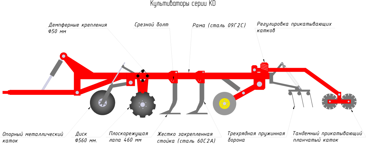Культиваторы серии КД предназначены для обработки почвы: предпосевной, осенней, паров, измельчения пожнивных остатков высокостебельных культур, разделки пластов, чизелевания.