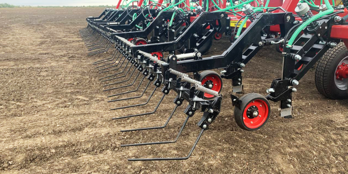 Рабочая часть (рама) посевного комплекса оснащена четырьмя рядами стоек 25х80 из стали 60С2А с анкерными сошниками толщиной 12мм с наплавкой твердосплавной пластины ВК8. Стойка с параллелограммной навеской позволяет создать давление на почву до 137 кг, что позволяет качественно обрабатывать почву на заданную глубину в разных климатических условиях и обеспечивает идеальное копирование поля.