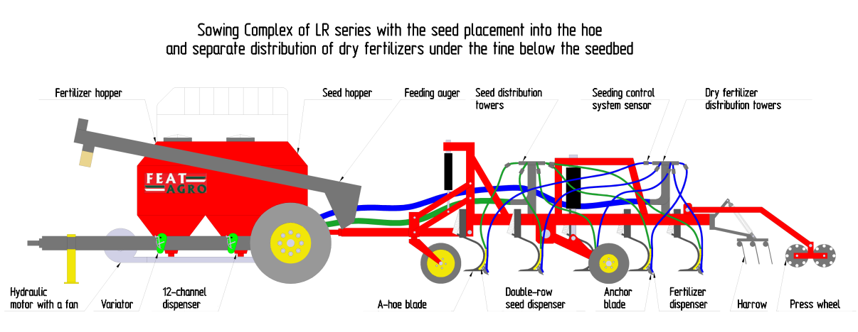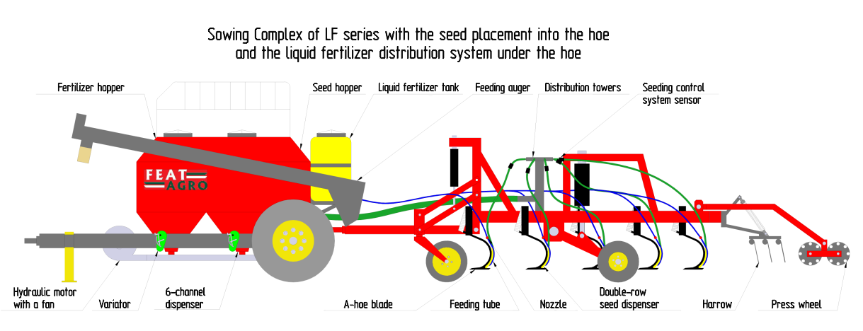 The combined sowing complex “FEAT” with the seed placement into the shovel is designed for band planting of cereal, legume and small-seeded crops simultaneously with granulated fertilizers on the untreated background and soil handling in the cultivation mode: pre-sowing, autumn and fallow cultivation.