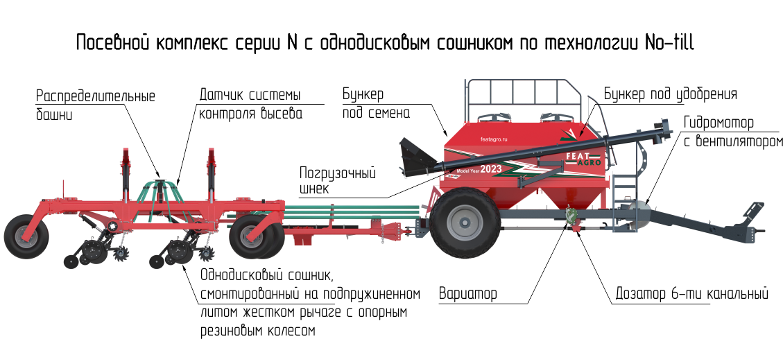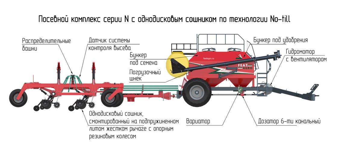 Посевной комплекс серии N предназначен для высева зерновых, зернобобовых, мелкосемянных, масличных культур, а также трав по минимальным (Mini-till) и нулевым (No-till) технологиям с одновременным внесением сухих гранулированных удобрений. Особенностью данного посевного комплекса является однодисковый сошник, смонтированный на подпружиненном литом жестком рычаге с опорным резиновым колесом, что позволяет развивать усилие врезания до 210 кг.